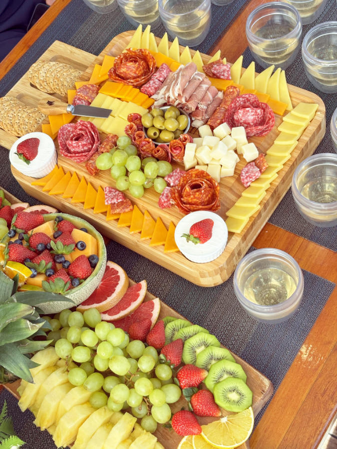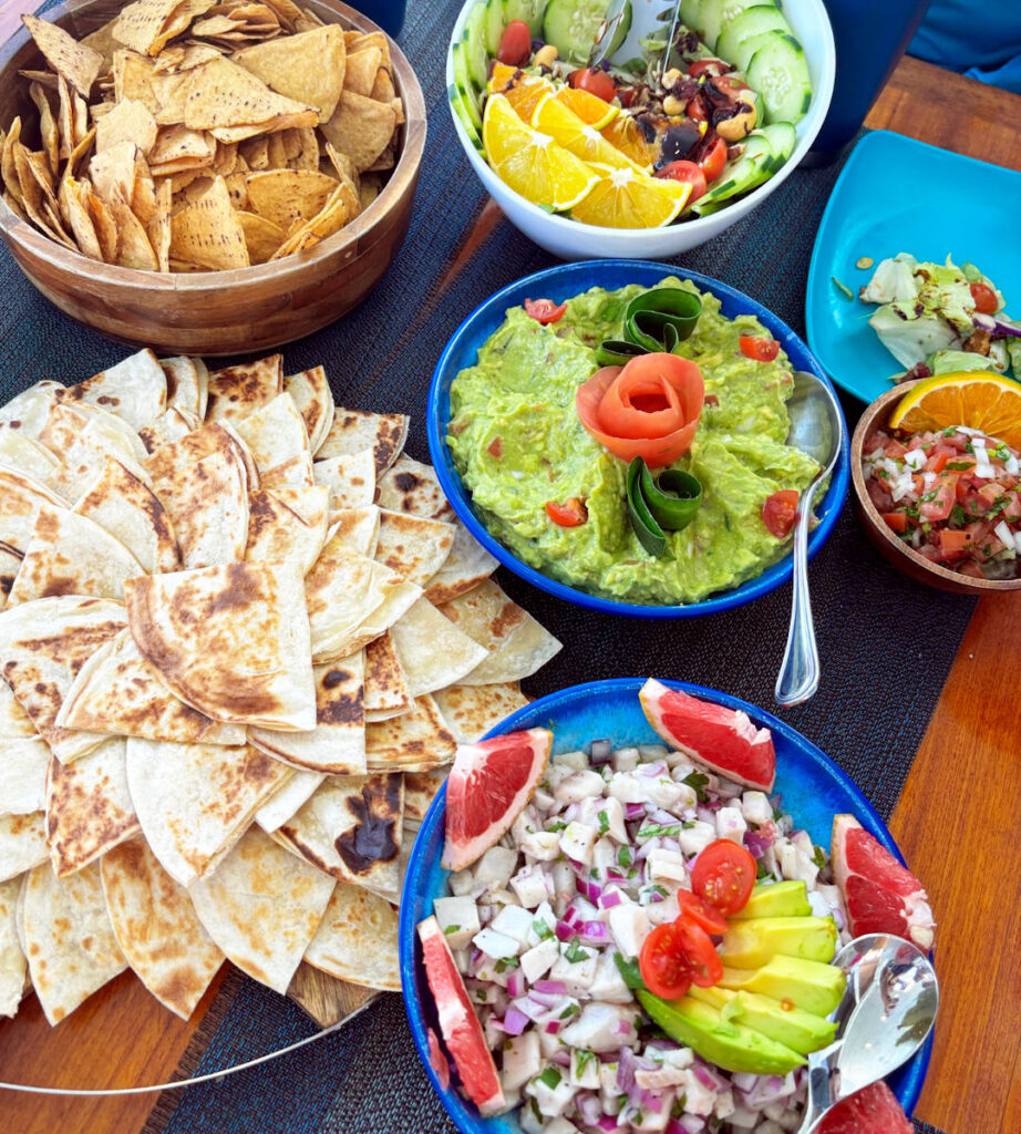 Local Fresh Seasonal Fruit, Snacks, Vegetable Crudites, Catch of the day! Fish Ceviche, Quesadillas, Guacamole, Pico de Gallo, Cookies.